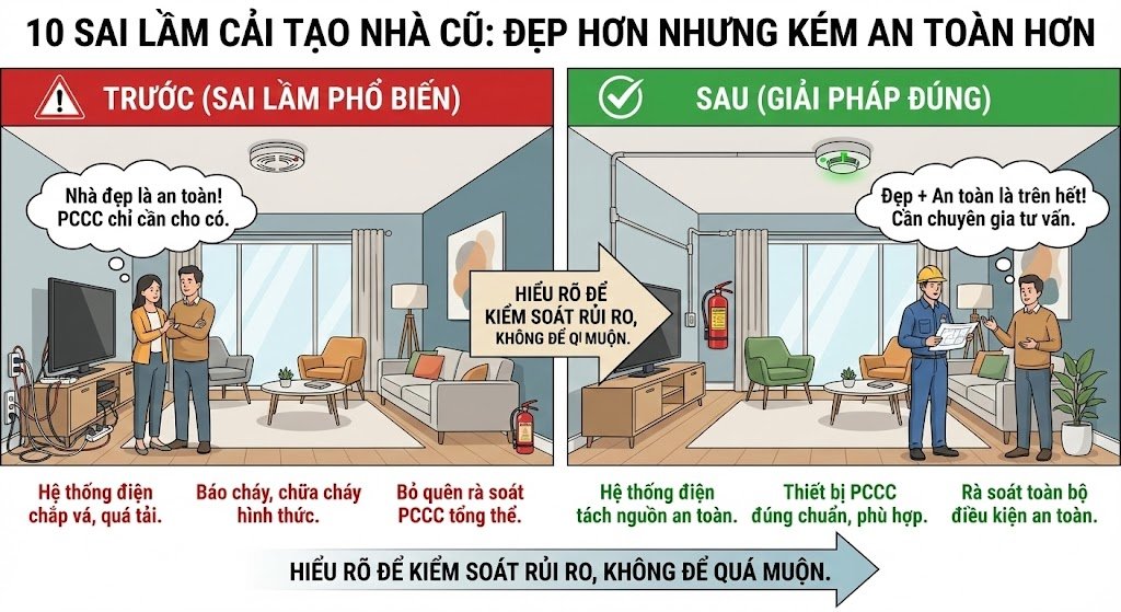 Bài viết này không nhằm hù dọa hay phức tạp hóa vấn đề, mà giúp bạn nhìn rõ 10 sai lầm phổ biến nhất khi cải tạo nhà cũ – những sai lầm đã khiến nhiều chủ nhà phải sửa đi sửa lại, tốn thêm chi phí, thậm chí đối mặt với rủi ro lớn khi xảy ra sự cố hoặc khi có kiểm tra thực tế. Quan trọng hơn, bạn sẽ hiểu vì sao nhà sau cải tạo thường nguy hiểm hơn trước và cần làm gì để kiểm soát an toàn cháy nổ một cách hợp lý, tiết kiệm và đúng bản chất.