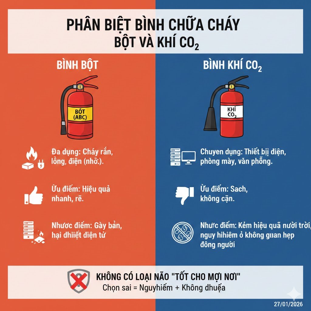Phân biệt đúng hai chủng loại bình chữa cháy phổ biến: Bình bột và bình khí CO₂