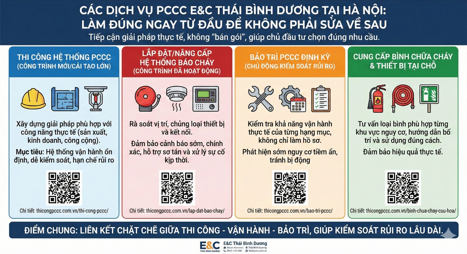 Khi đi sâu vào nhu cầu thực tế của các công trình tại Hà Nội, có thể thấy rằng mỗi giai đoạn sử dụng lại phát sinh một bài toán PCCC khác nhau. Vì vậy, E&C Thái Bình Dương không tiếp cận dịch vụ theo kiểu “bán gói”, mà tách rõ từng nhóm giải pháp để chủ đầu tư lựa chọn đúng thứ mình đang cần.