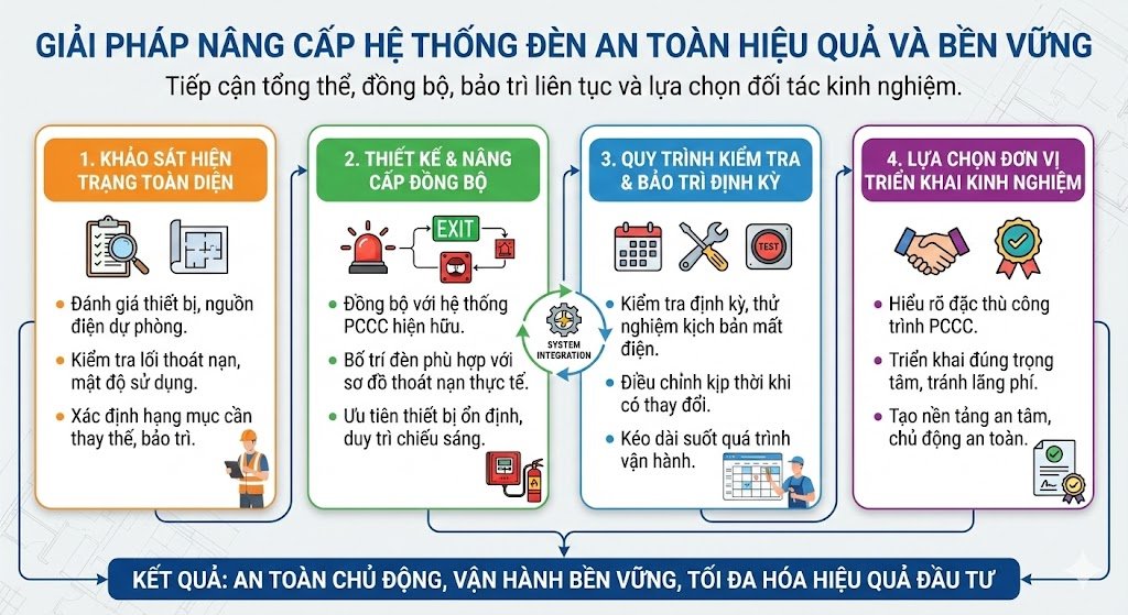 Một giải pháp bền vững là nâng cấp hệ thống đèn an toàn theo hướng đồng bộ với toàn bộ hệ thống PCCC hiện hữu. Đèn chiếu sáng sự cố và đèn chỉ dẫn thoát nạn cần được bố trí phù hợp với sơ đồ thoát nạn thực tế, đồng thời đảm bảo khả năng tự động kích hoạt khi có sự cố. Việc lựa chọn thiết bị cần ưu tiên tính ổn định, khả năng duy trì chiếu sáng trong thời gian cần thiết và sự phù hợp với điều kiện vận hành lâu dài, thay vì chỉ chú trọng giá thành ban đầu.
