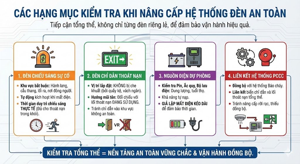 Khi bắt đầu nâng cấp hệ thống đèn an toàn, sai lầm phổ biến nhất là chỉ nhìn vào từng chiếc đèn riêng lẻ mà bỏ qua toàn bộ bức tranh vận hành của công trình. Trên thực tế, việc nâng cấp hiệu quả luôn bắt đầu từ khâu kiểm tra tổng thể các hạng mục liên quan, nhằm đảm bảo rằng khi xảy ra sự cố, ánh sáng an toàn được duy trì liên tục và dẫn hướng đúng cho người thoát nạn.