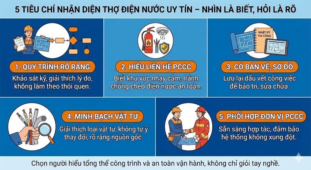Làm thế nào để nhận diện một thợ thi công điện nước thực sự uy tín, không chỉ giỏi tay nghề mà còn hiểu và làm đúng các yêu cầu an toàn, PCCC?