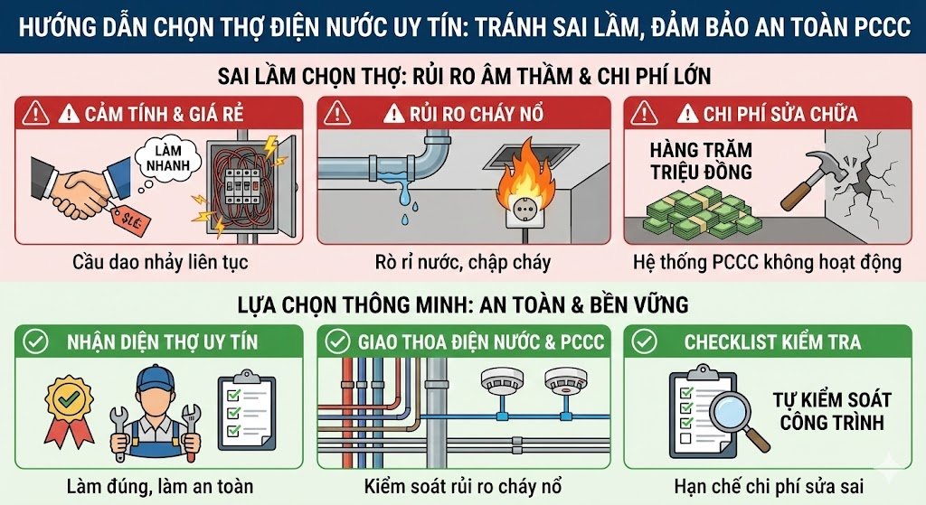 Nhìn vào 5 tiêu chí trên, bạn sẽ nhận ra rằng vấn đề không chỉ là chọn được thợ điện nước giỏi tay nghề, mà là chọn được người hiểu tổng thể công trình và an toàn vận hành.