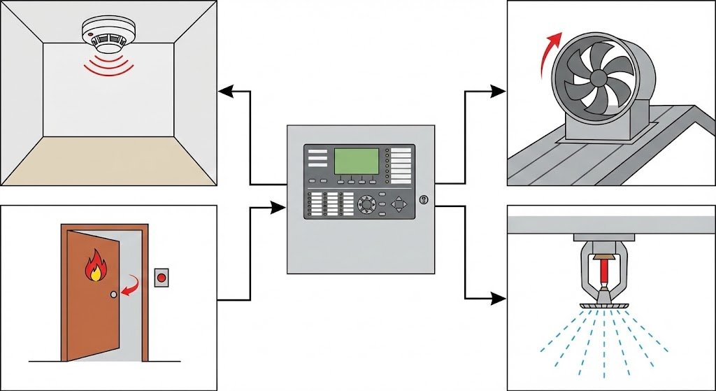 Khi một điểm cháy được kích hoạt, hệ thống địa chỉ có thể điều khiển đồng thời nhiều thiết bị để tối ưu đường thoát hiểm và giảm khói lan.
