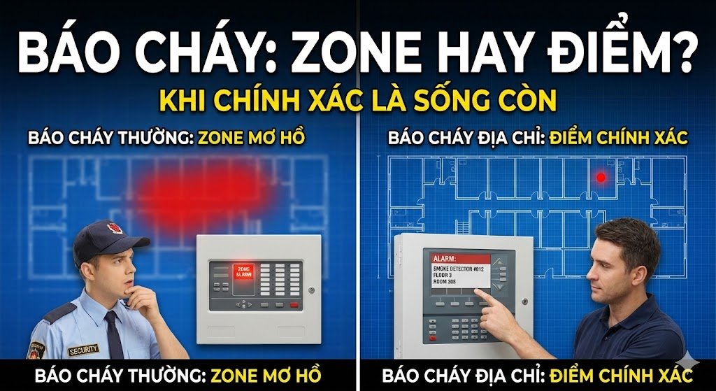 Hệ thống báo cháy thường chỉ báo “Vùng 3” hoặc “Tầng 2”, buộc lực lượng vận hành phải di chuyển để tìm vị trí cháy thật sự.