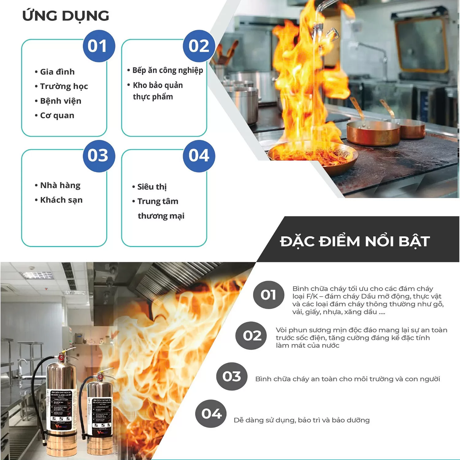 Đây là lựa chọn lý tưởng cho các khu vực bếp ăn công nghiệp, nhà hàng, khách sạn, và khu bảo quản thực phẩm, nơi có nguy cơ cao về các đám cháy dầu mỡ.