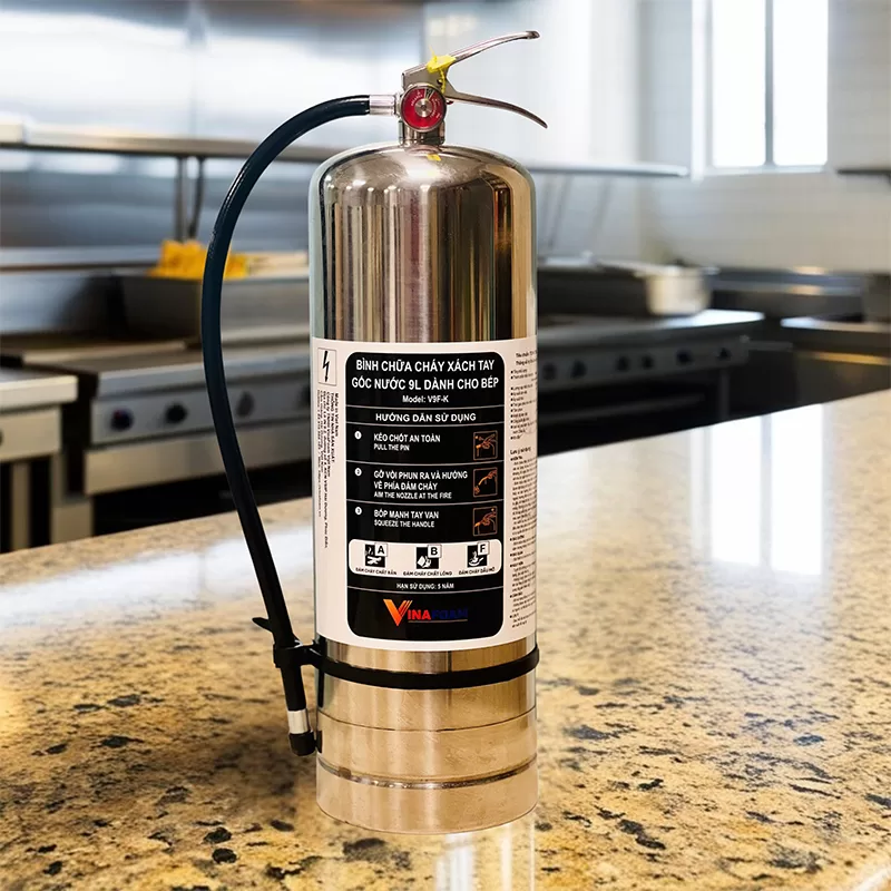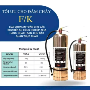 Bình chữa cháy chuyên dụng cho nhà bếp Vinafoam V9F-K là một loại bình chữa cháy xách tay, được thiết kế đặc biệt để đối phó với các đám cháy phát sinh trong môi trường bếp. Bình sử dụng dung dịch chữa cháy với công thức độc đáo, được chứng nhận là thân thiện với môi trường và an toàn cho người sử dụng. Khả năng phun sương nước của bình giúp việc sử dụng an toàn ngay cả với các đám cháy liên quan đến thiết bị điện đang hoạt động.