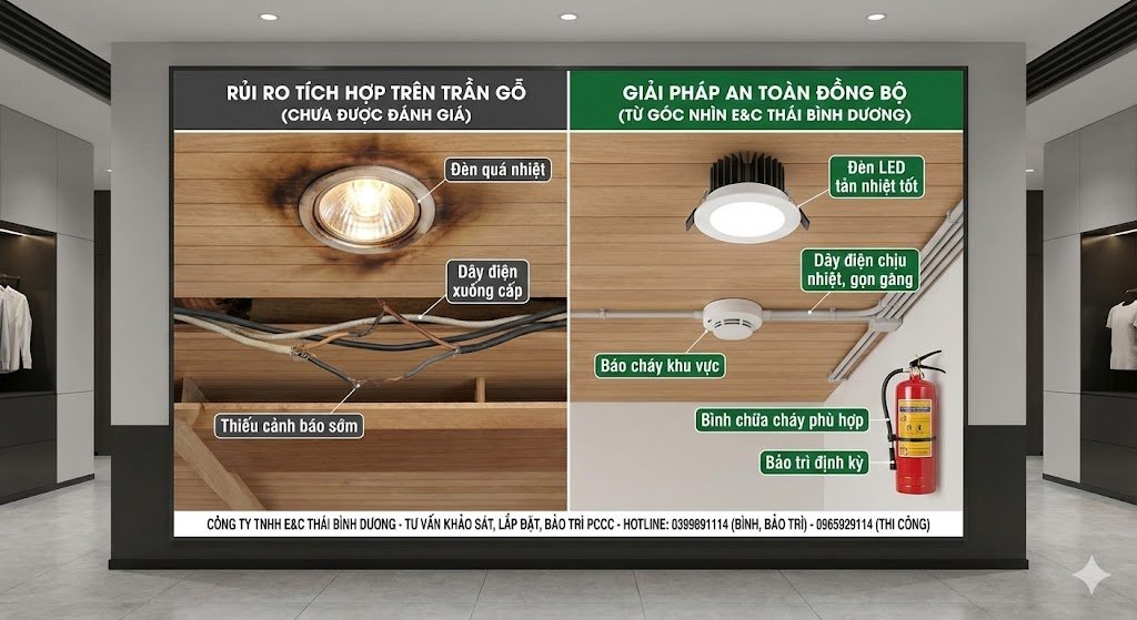 Đây chính là lý do vì sao các công trình sử dụng trần gỗ cần được nhìn nhận dưới góc độ an toàn PCCC tổng thể, thay vì chỉ xử lý riêng lẻ từng chiếc đèn.