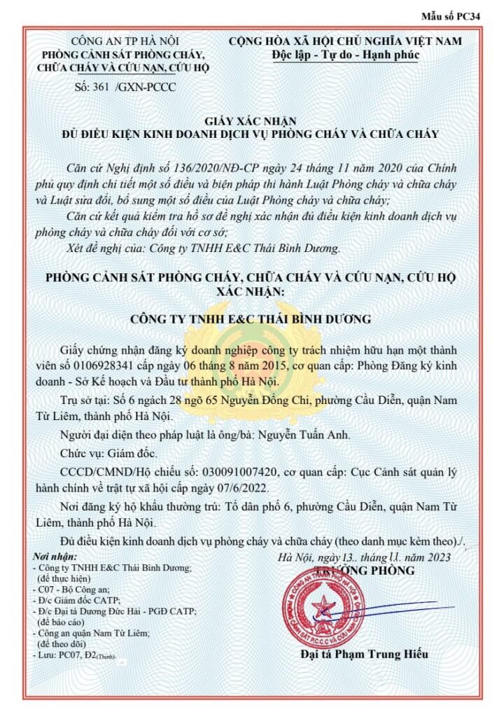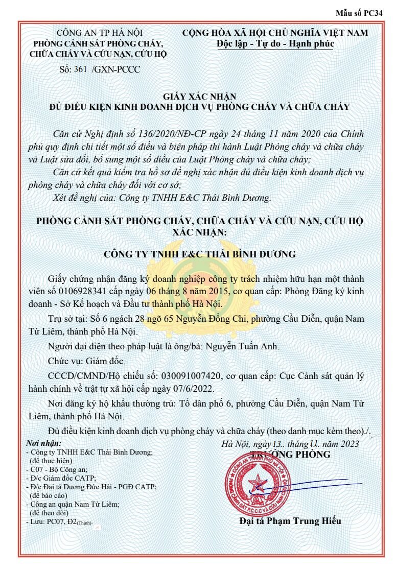 E&C Thái Bình Dương là doanh nghiệp đã được cơ quan Cảnh sát Phòng cháy, chữa cháy và Cứu nạn, cứu hộ – Công an thành phố Hà Nội cấp Giấy xác nhận đủ điều kiện kinh doanh dịch vụ phòng cháy và chữa cháy theo quy định của pháp luật.