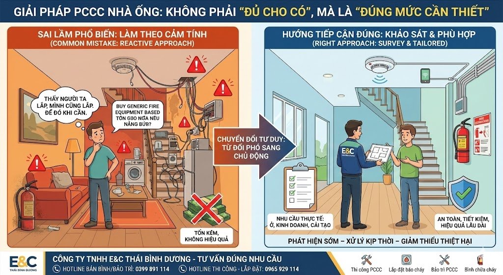 Đây cũng là cách mà nhiều gia đình lựa chọn khi làm việc với Công ty TNHH E&C Thái Bình Dương. Thay vì bán gói sẵn, chúng tôi thường bắt đầu bằng việc trao đổi để hiểu rõ hiện trạng nhà ống, cách sử dụng, mức độ nóng và những rủi ro đang bị bỏ qua. Từ đó mới tư vấn các hạng mục thực sự cần thiết như lắp đặt báo cháy, bảo trì PCCC định kỳ, thi công PCCC phù hợp quy mô, hoặc cung cấp bình chữa cháy đúng chủng loại, đúng vị trí sử dụng.