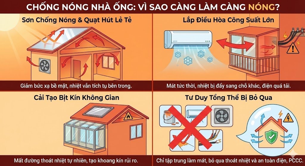 Vì vậy, nóng không chỉ là vấn đề tiện nghi, mà là dấu hiệu cho thấy cách xử lý đang đi sai hướng. Nếu chỉ sơn chống nóng, lắp thêm điều hòa hoặc thay quạt mạnh hơn, bạn thực chất đang đè nhiệt xuống chứ không giải quyết nó. Vấn đề cốt lõi của nhà ống nằm ở chỗ nhiệt không có đường thoát, không gian kỹ thuật không được kiểm soát và an toàn điện – an toàn cháy nổ chưa được nhìn như một phần của bài toán chống nóng. Chính vì vậy, ở phần tiếp theo, chúng ta cần nhìn lại những cách chống nóng phổ biến hiện nay và vì sao rất nhiều giải pháp tưởng đúng lại đang làm sai từ gốc.