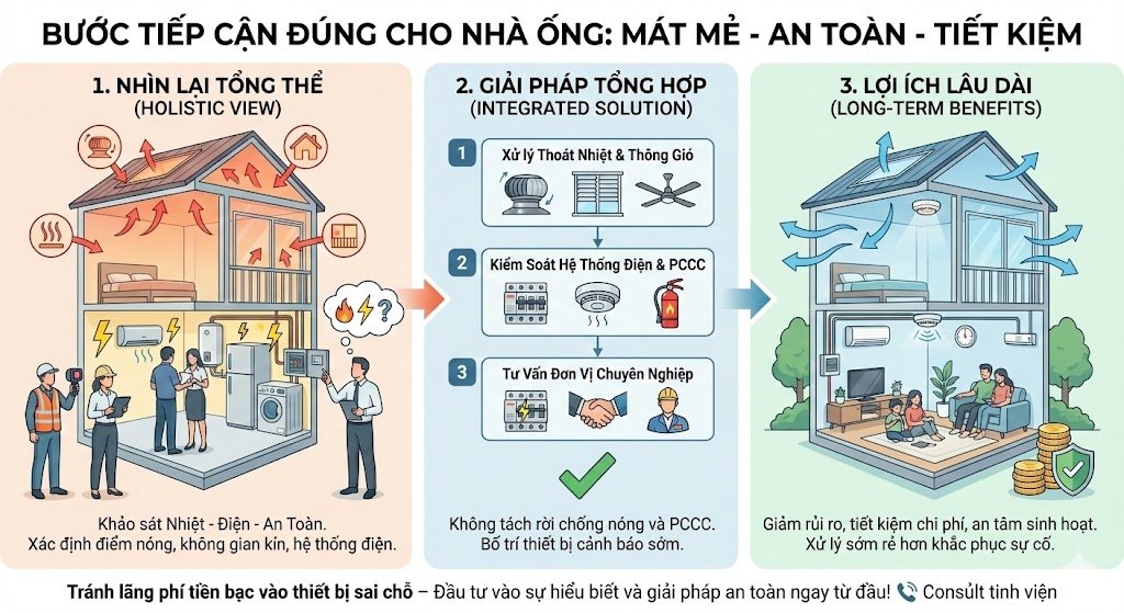 Điểm chung của tất cả các cách trên là tập trung vào làm mát, ít quan tâm đến thoát nhiệt và gần như bỏ qua yếu tố an toàn điện, an toàn cháy nổ. Trong khi đó, với nhà ống, chống nóng đúng nghĩa phải đi kèm kiểm soát nhiệt, kiểm soát không gian và kiểm soát rủi ro. Vậy đâu là hướng xử lý hợp lý hơn, giúp nhà ống vừa dễ chịu hơn, tiết kiệm hơn, và quan trọng nhất là an toàn khi sử dụng lâu dài? Phần tiếp theo sẽ trả lời câu hỏi này bằng một cách tiếp cận khác hẳn với những gì nhiều người đang làm hiện nay.
